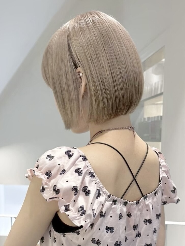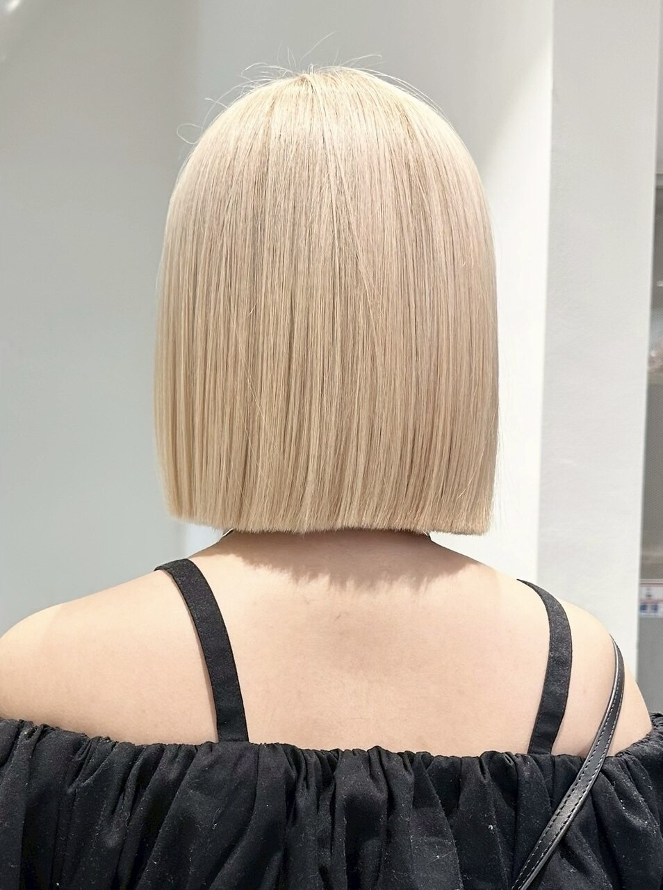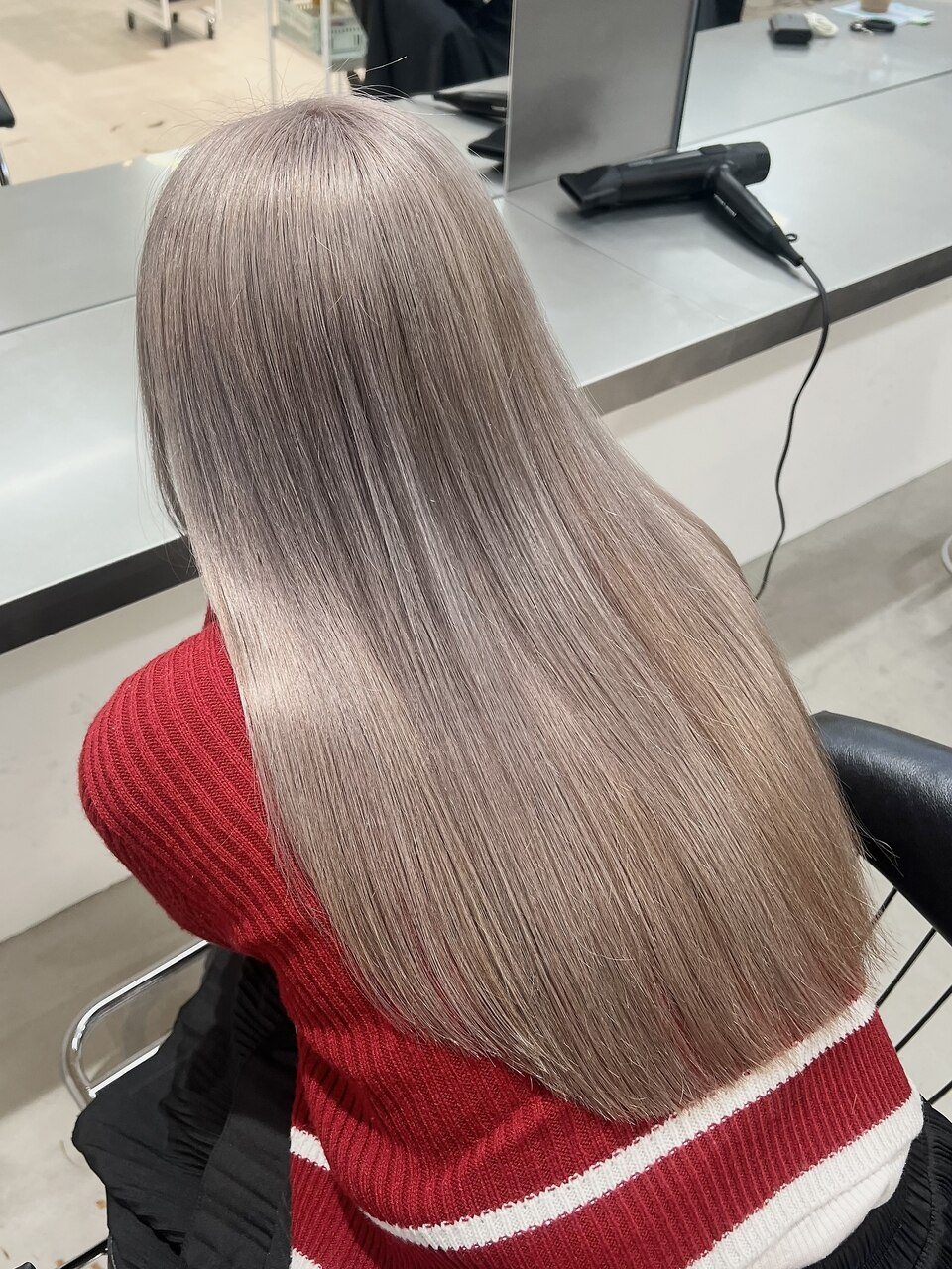 ケアブリーチ2回でしっかり色を抜きムラなのないベースを作ります。その後透明感カラー仕上げに◎ブロンドやペールカラー、ホワイトベージュを希望される方はこちらをお選びください!+¥3,300でカット付きに変更可(ロング料金 鎖骨下¥770 胸下¥1100 ヘソ¥5500)