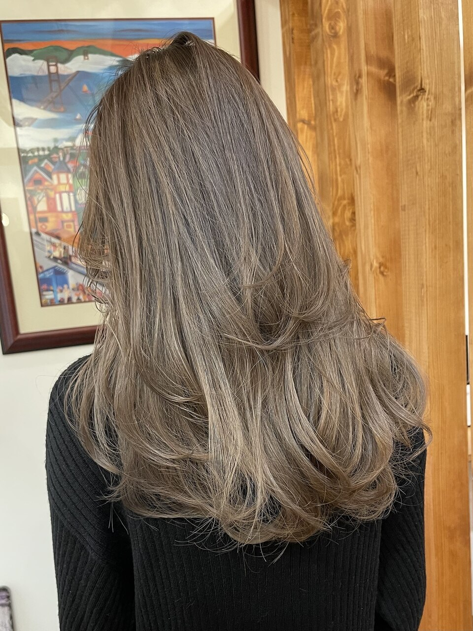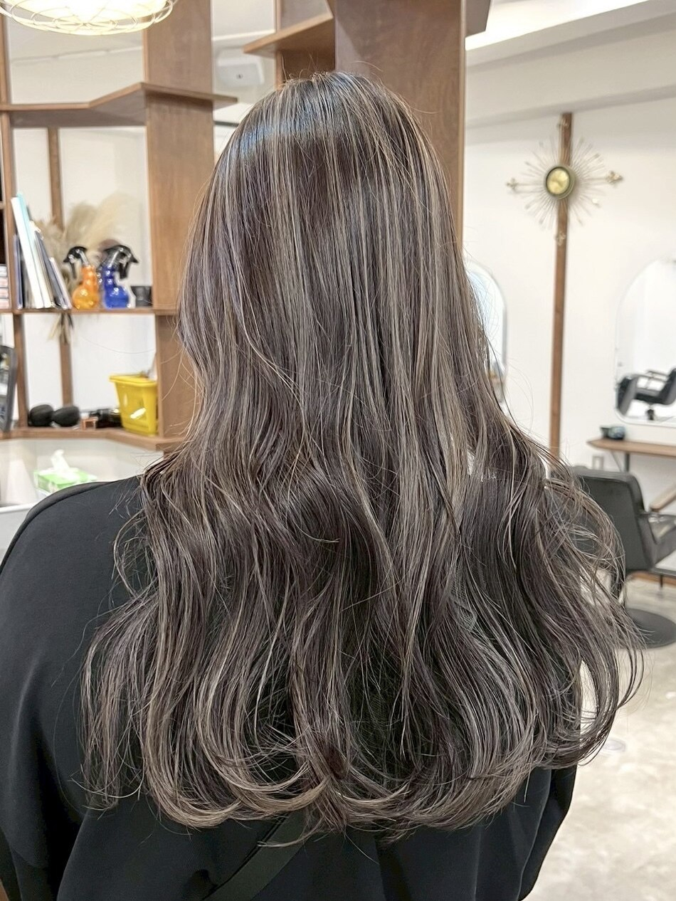 ハイライトやローライトをバランスよく入れ光に透かしたような透明感デザインカラーを楽しめます。顔周りカットやレイヤーカットと相性◎※黒染め/パーマ履歴のある方は予約時お申し付け下さい。(ロング料金 鎖骨下¥770 胸下¥1100 ヘソ¥5500)