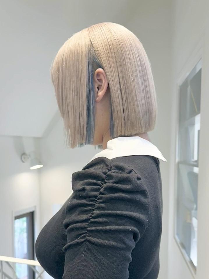 ニュアンスペールブルーのぱつんとボブ
